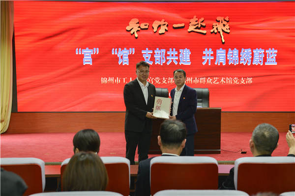 工人文化宮黨支部書記張家朋代表支部贈送群眾藝術館黨支部的共建禮物(王丹先生題寫的書法作品“和你一起飛”)