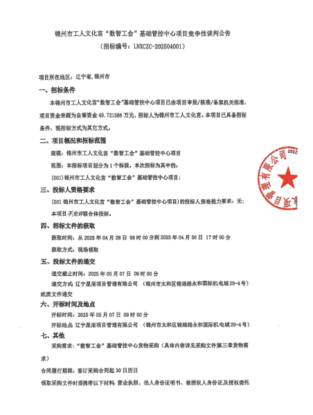 錦州市工人文化宮“數(shù)智工會(huì)”基礎(chǔ)管控中心項(xiàng)目競(jìng)爭(zhēng)性談判公告