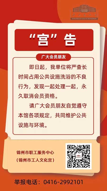 職工會館是錦州市職工服務中心為廣大勞模、離退休老同志、社會各界職工群眾提供的休閑、娛樂、健身的綜合公共活動場所。為了滿足廣大會員的需求,每年都投入大量的人力、物力、財力,全方位確保各項設施設備運轉正常。近期,有眾多會員反映個別人士長時間占用公共設施洗浴,導致淋浴房供水不足、其他會員健身運動后不能洗浴的問題。為了維護廣大會員的權益、節(jié)約運營成本、避免浪費公共資源,從即日起,我單位將嚴查長時間占用公共設施洗浴的不良行為,發(fā)現一起處理一起,永久取消會員資格。請廣大會員務必自覺遵守本館各項規(guī)定,共同維護公共設施與環(huán)境。