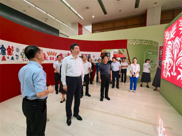 靳國衛(wèi)在參觀過程中,仔細欣賞了各類剪紙作品,并與非遺傳承人親切交流,詳細了解剪紙技藝的保護與傳承情況。靳國衛(wèi)指出,要突出本土剪紙獨具特色的藝術(shù)價值,強調(diào)其人與自然和諧相處的內(nèi)涵,展現(xiàn)其貼近人民生活的本質(zhì);要加強宣傳推廣,提升剪紙展及剪紙藝術(shù)的影響力,建立傳承人譜系;要進校園設(shè)立剪紙?zhí)厣n程,同時進文化館、企業(yè)、社區(qū)等,推動剪紙融入美育教育;要注重實際運用與衍生品開發(fā),擴大傳播范圍,以“用”促傳承;要鼓勵創(chuàng)新融合,推動傳統(tǒng)剪紙形式與現(xiàn)代藝術(shù)理念結(jié)合,增強傳播力和接受度;要發(fā)揮帶動作用,通過剪紙藝術(shù)帶動群眾學習傳承各類非物質(zhì)文化遺產(chǎn),做好相關(guān)培育工作。